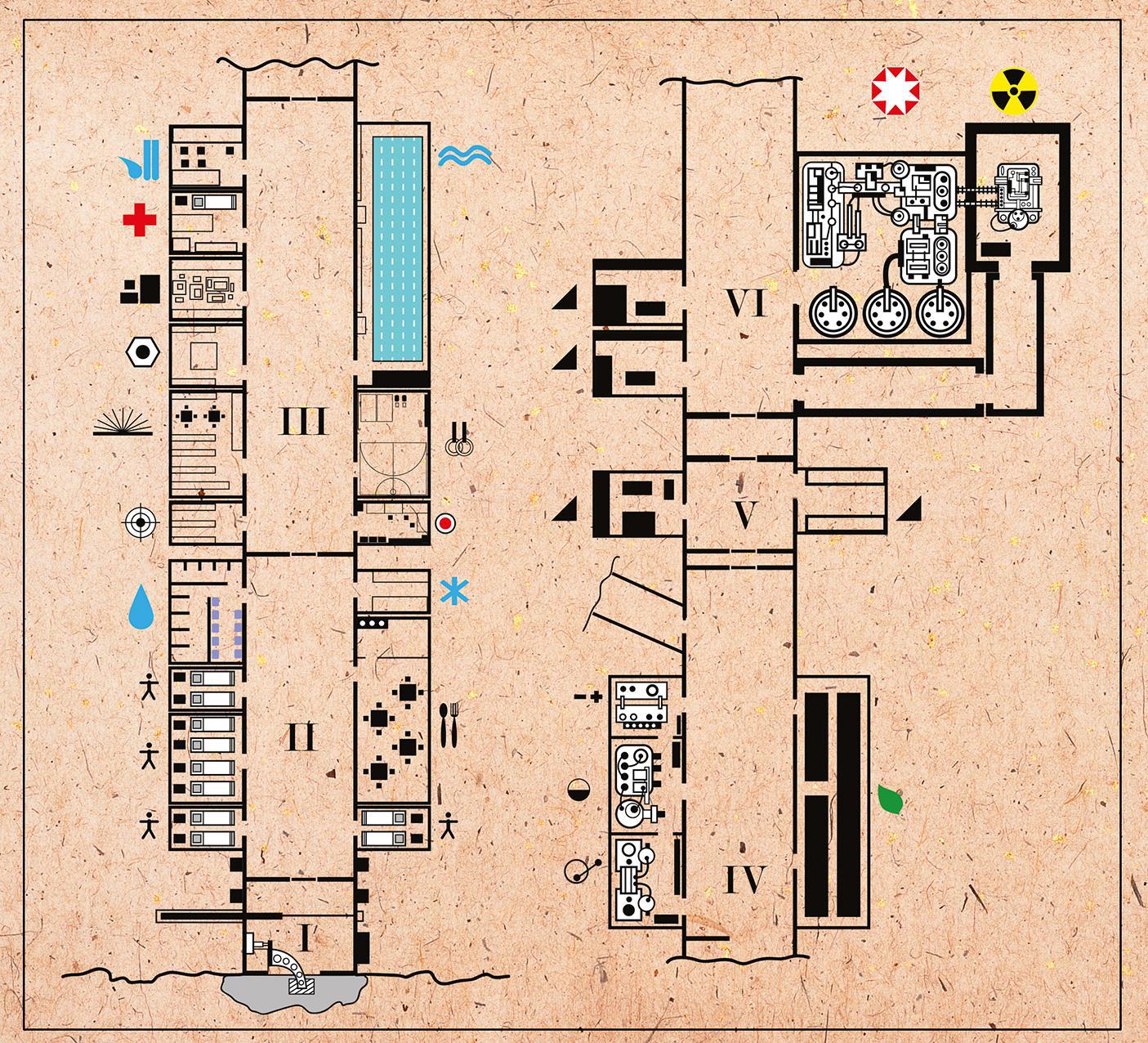 Убежище у меня в горе, полностью автономное. Для контингента есть- библиотека, бассейн, лаборатория, компрессорная, спорт зал, столовая, комнаты для сна (кубрики), амбулатория, склады, оружейная комната, пульт управления (да-да- там, с красной кнопкой которая).