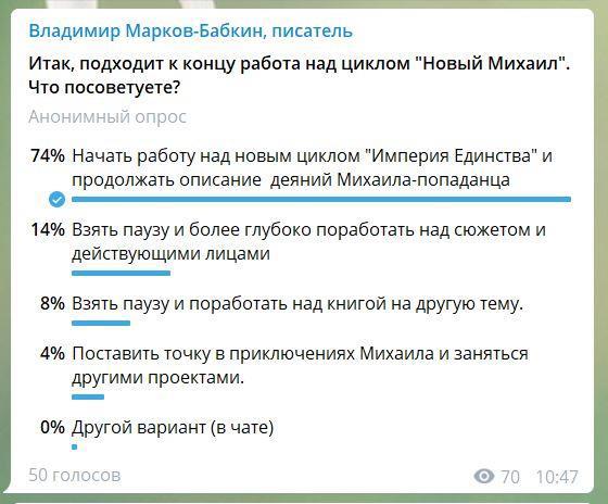 Опрос на моем канале Telegram относительно перспектив цикла "Новый Михаил". Не знаю, можно ли прикрутить опрос непосредственно на АТ, но пока можно высказать свое мнение в комментариях или проголосовать в Телеграм. Спасибо!