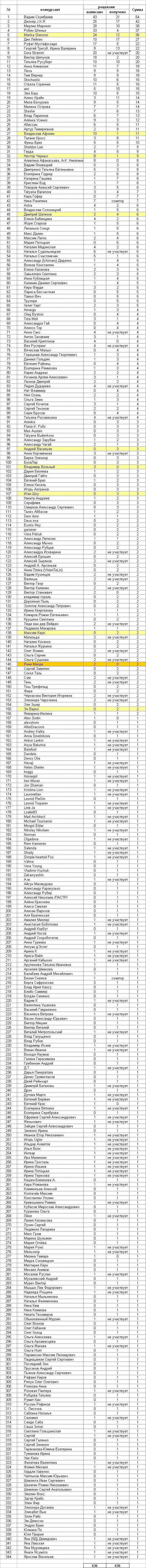 P.S. Жёлтым цветом отмечены авторы, снявшие свои произведения с конкурса, но чьи рецензенты при этом не пострадали. Чуть потемнее цвет у Рене Маори (рецензии на его книгу (5 конкурсных рецензий) пока не отображаются в базе).