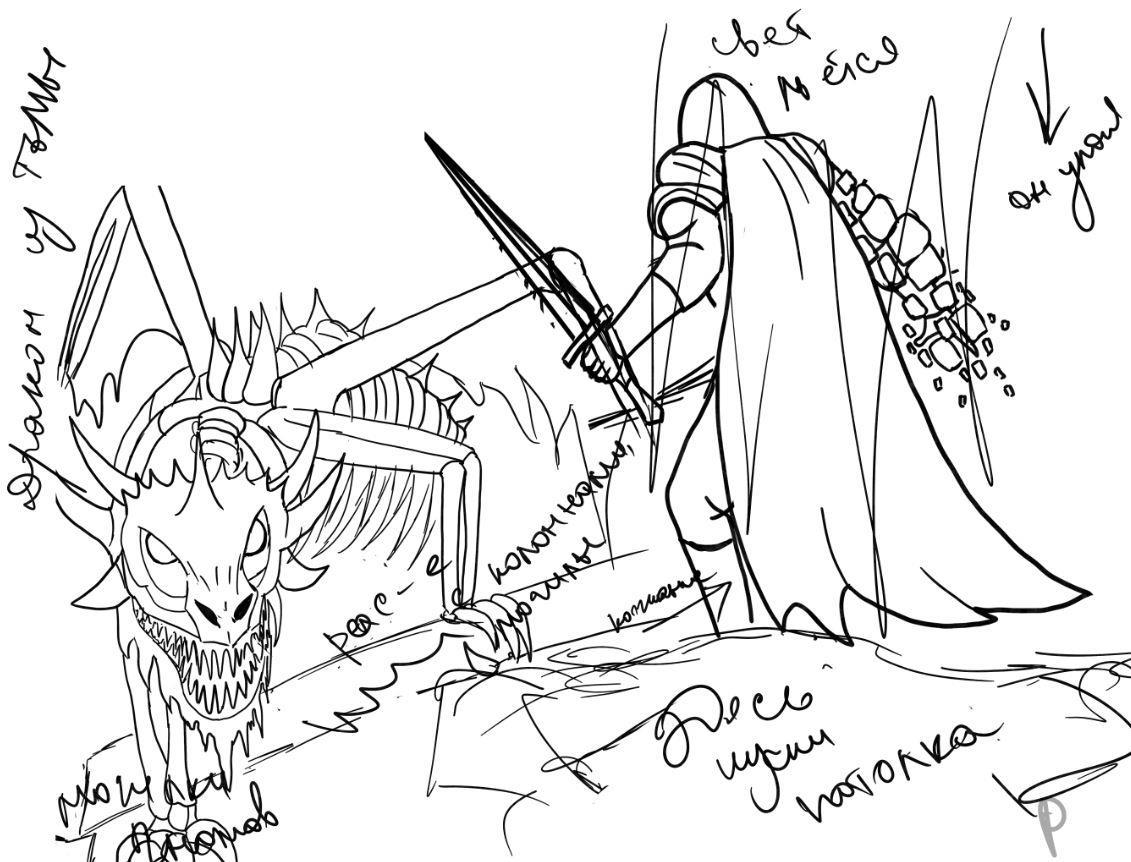 И, если с ГГ все понятно, то с драконом непонятно ничего. Это был мой первый дракон в жизни! Да еще и костяной! Макет и перерисовка заняли несколько дней. Мне постоянно не нравился результат в цвете, поэтому приходилось все зачеркивать и заново начинать со скетча.