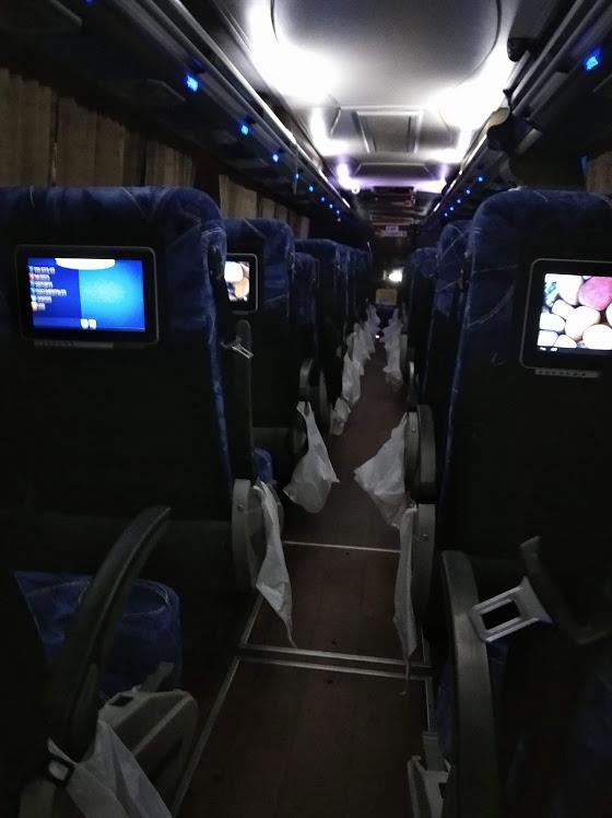 Внутри  это практически самолет. Кстати, экипаж именно его и косплеит: внешним видом и кормлением пассажиров в дороге за счет купленного билета. В среднем 1 час поездки исчисляется в размере доллар-полтора. На дальних рейсах автобусы оснащены туалетами.