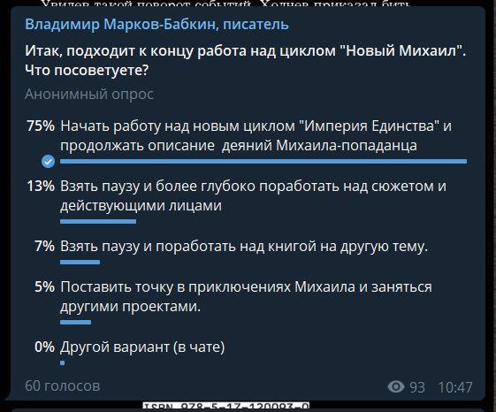 С 28 июня идет голосование читателей относительно перспектив цикла "Новый Михаил" и пожеланий автору. По состоянию на утро 4 июля имеем такие цифры.