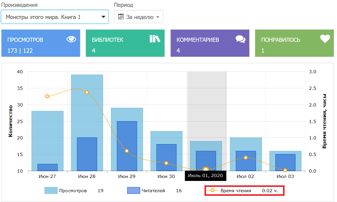 Теперь мы просто делим общее время чтения (2495 ч) на необходимое время чтения вашего произведения (11 ч). И получаем некое виртуальное количество читателей как бы дочитавших вашу книгу до самого конца. В моём случае: 227 человек. Теперь я могу с уверенностью утверждать, что книгу читало не меньше 227 человек.