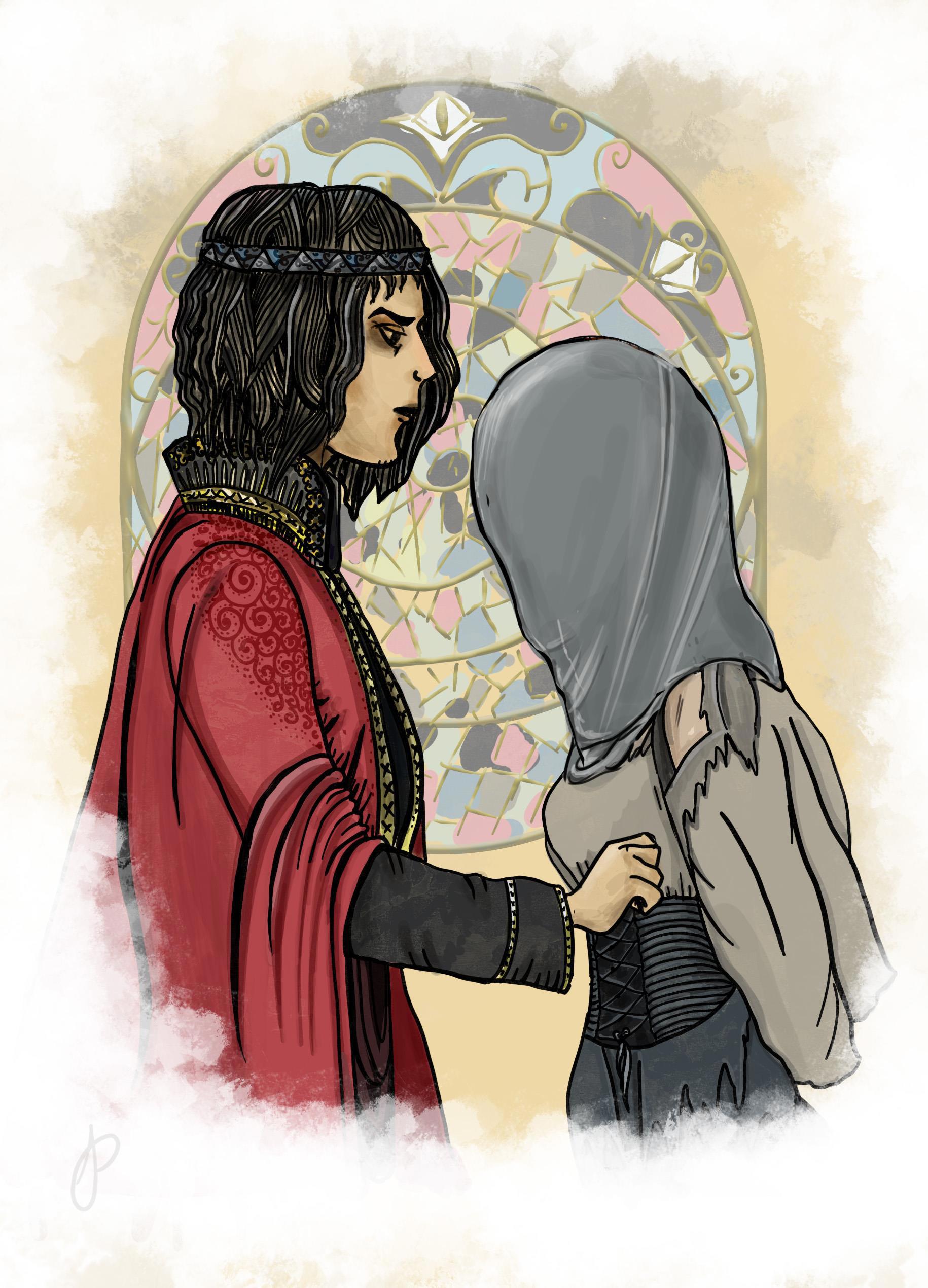 На мой взгляд, мешок на голове лишний, как думаете? По лору он исчезает из видимости глаз, когда мужчина (слева) начинает колдовать. Но с другой стороны с мешком лучше, потому что он скрывает мои огрехи