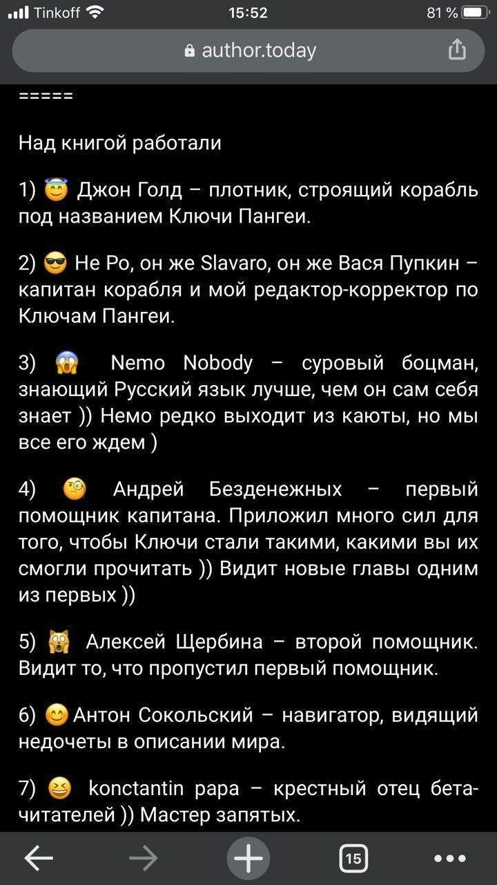 1) Ключи Пангеи-3 были завершены 27 июня и теперь переходят в стадию финальной вычитки. Сюжет не изменится. Как только еще раз все проверим на предмет ошибок, я заменю текст глав на АвторТудей.