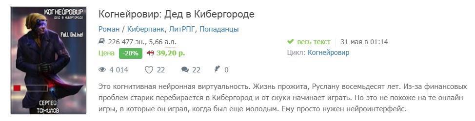 Автор: Серж ТомиловЧто может быть лучше драйва литрпг или атмосферы киберпанка — только все вместе! Свеженький роман этого года «Когнейровир»— начало серии про игру будущего, ставшую новым захватывающим миром для людей всех поколений. В реальности будущего могут греметь гибридные войны, коварные пандемии, смены эпох, идей и формаций, но игра остается игрой со своими законами.