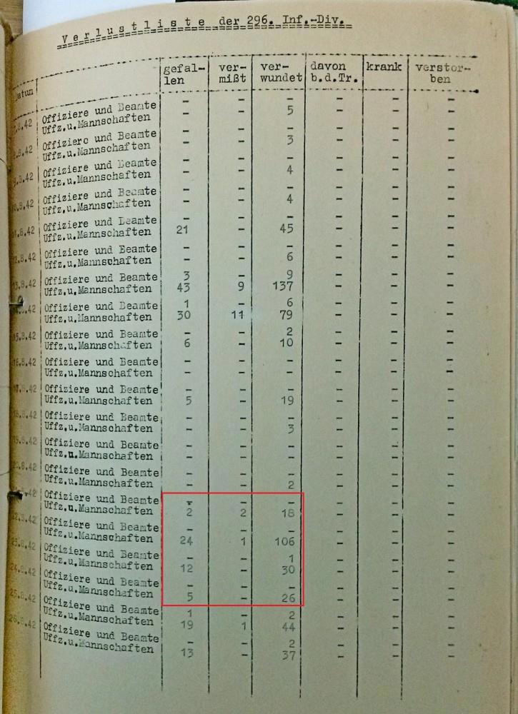 Противостояла им немецкая 296-я пд, чьи потери у меня тоже есть (красным квадратом выделил потери за 21 - 24 августа 1942 года):