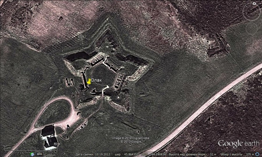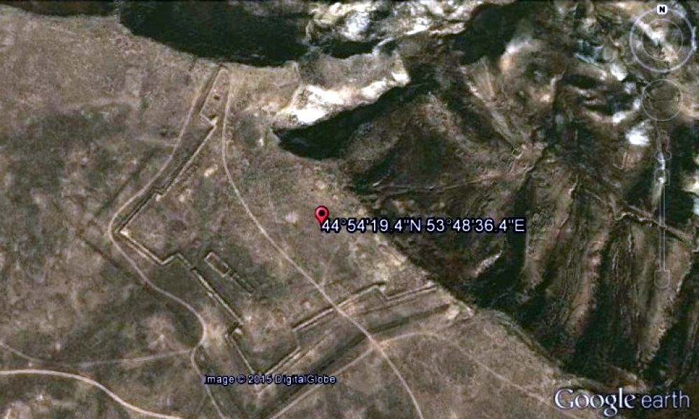 Ну, а теперь подробности. Начну с родного Каспия, пожалуй. Местечко баламутное из-за этого самого водоёма, поэтому со всякими строениями древними здесь непросто, но звезда есть и здесь. Она находится на восточном берегу Каспия… сейчас там почти ничего нет. Одни остатки. В середине «фортеции» пару развалившихся кирпичных строения, а по периметру остатки ограды в виде звезды. Ещё табличка есть, что мол, охраняется государством (и больше никем). Сверху гуголь показывает это место вот эндак… звёздочку видите? А то половину уже Каспий смыл...