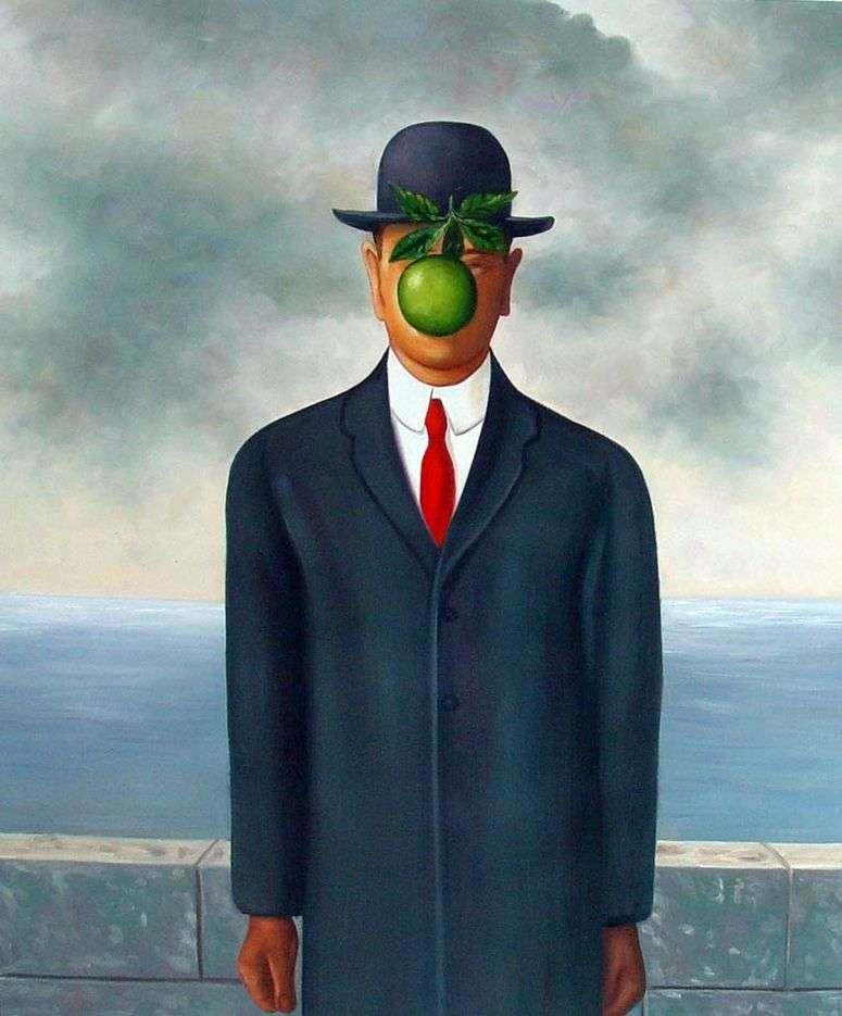 Магритт писал эту картину как автопортрет. Но поскольку каждая его картина является в большей степени философской притчей, а не просто красивым рисунком, то каждый зритель трактует "Сына человеческого" по-разному.Самое распространенное объяснение: перед нами современный потомок Адама. А яблоко символизирует искушения, которые продолжают преследовать человека и в современном мире.