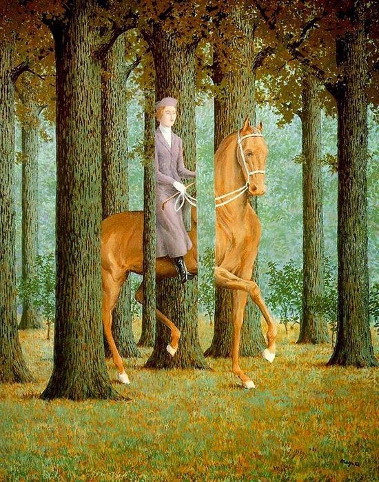 .«В картине "Карт-бланш" наездница заслоняет собой деревья, а они заслоняют ее. Однако сила мышления объемлет и зримое, и незримое, и я при помощи живописи делаю мысли видимыми»...". Магритт