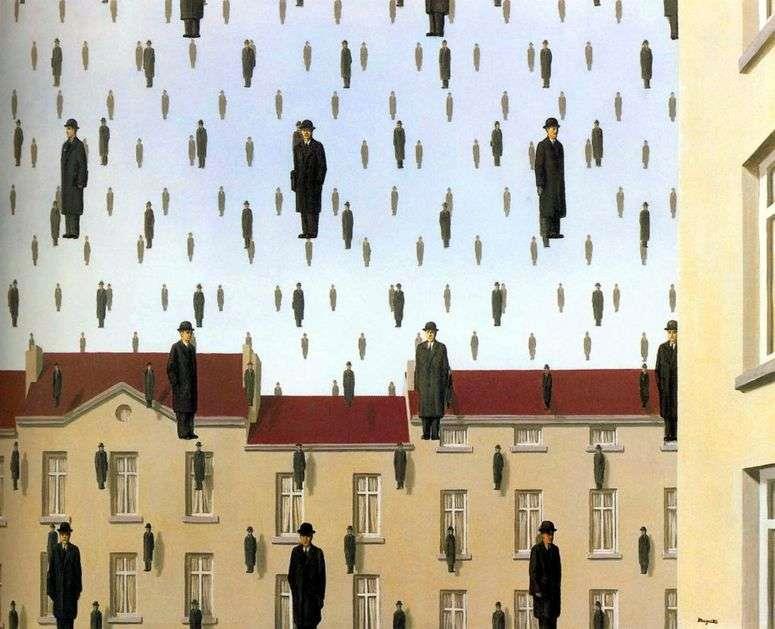 Следуя этому правилу, он назвал свою картину "Голконда". Пусть зритель догадается сам, какое отношение имеет полулегендарный индийский город, славившийся золотыми россыпями и алмазами, к зависшим в воздухе котелкам.