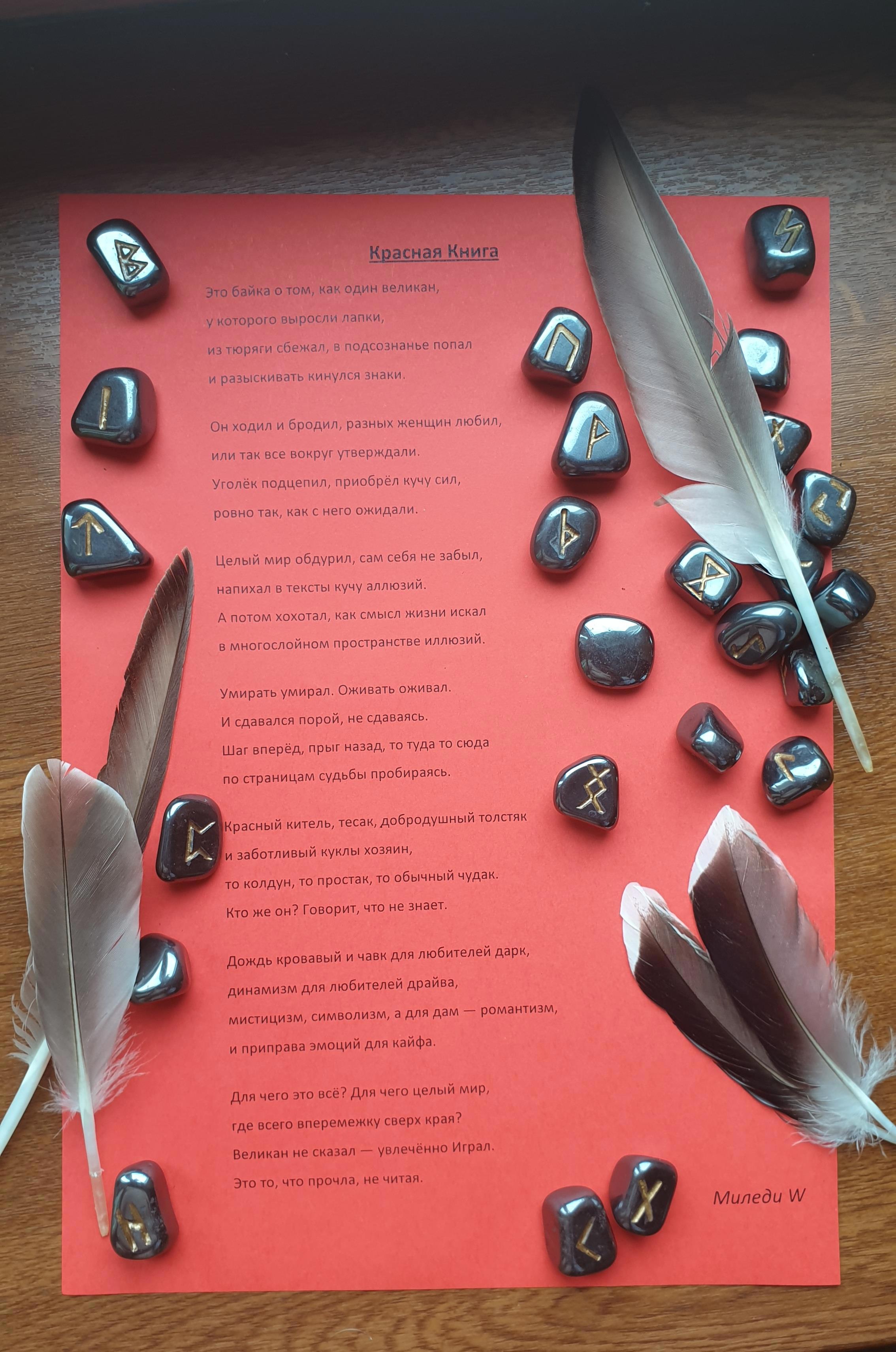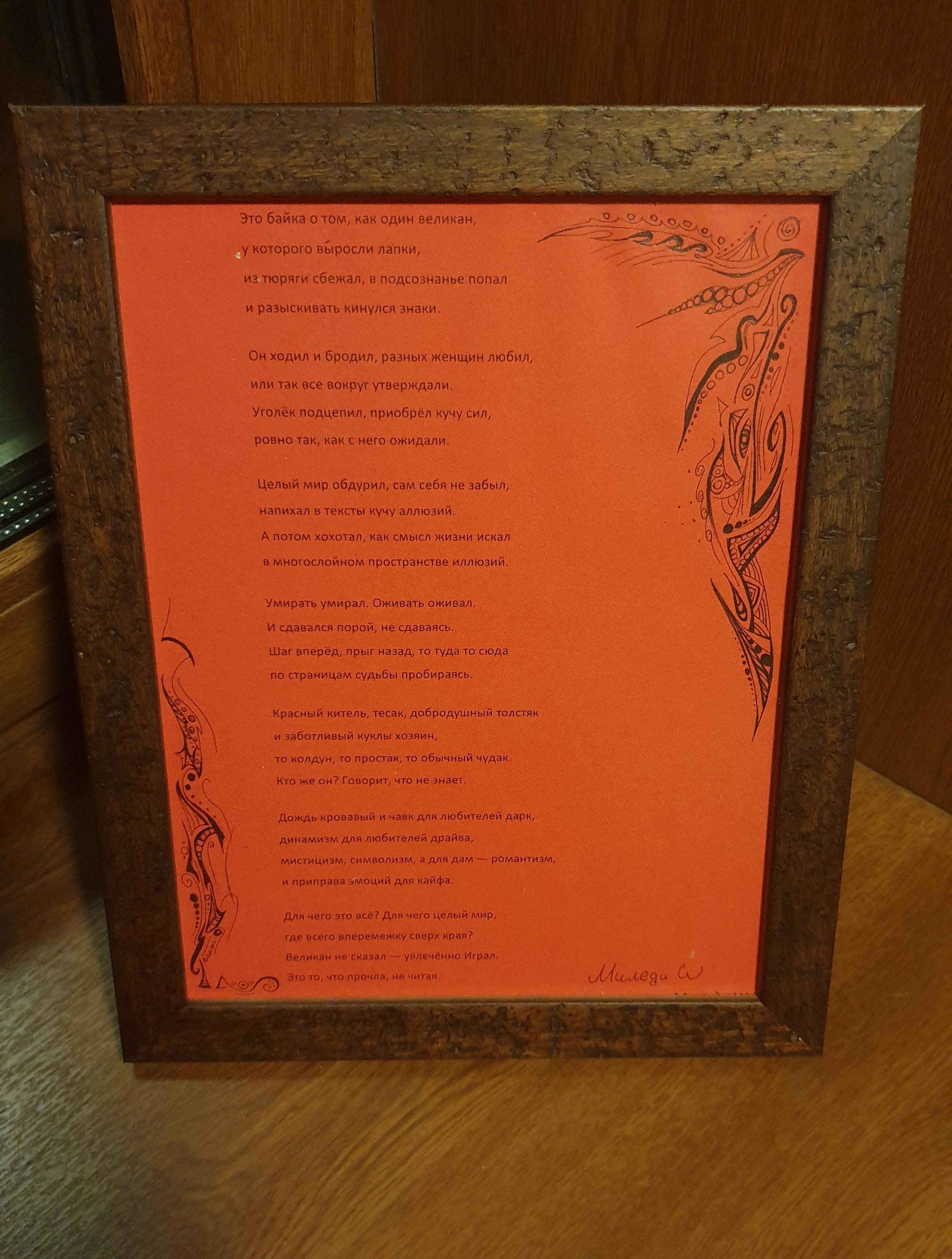 Миледи W. посвятила мне и Красной Книге стихотворение. Что делать? Потёр рунами, да повесил в рамку.