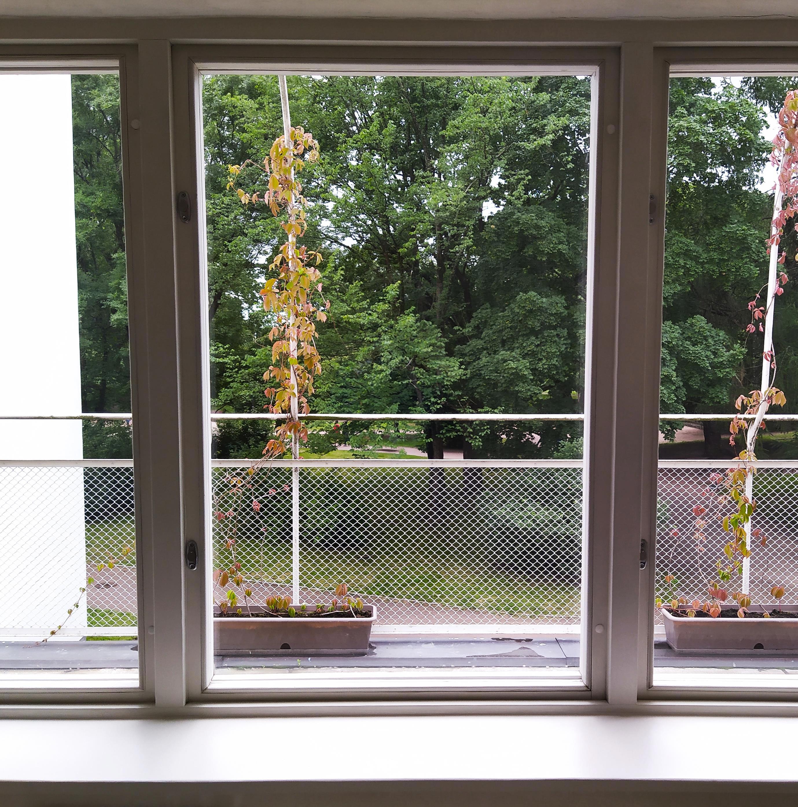 В недрах парка прячется этакий геометрический гимн функционализму и модерну. Строго, скромно. Кроме огромного окна в клеточку и сплошной стены слева моего обывательского внимания ничто не привлекает: