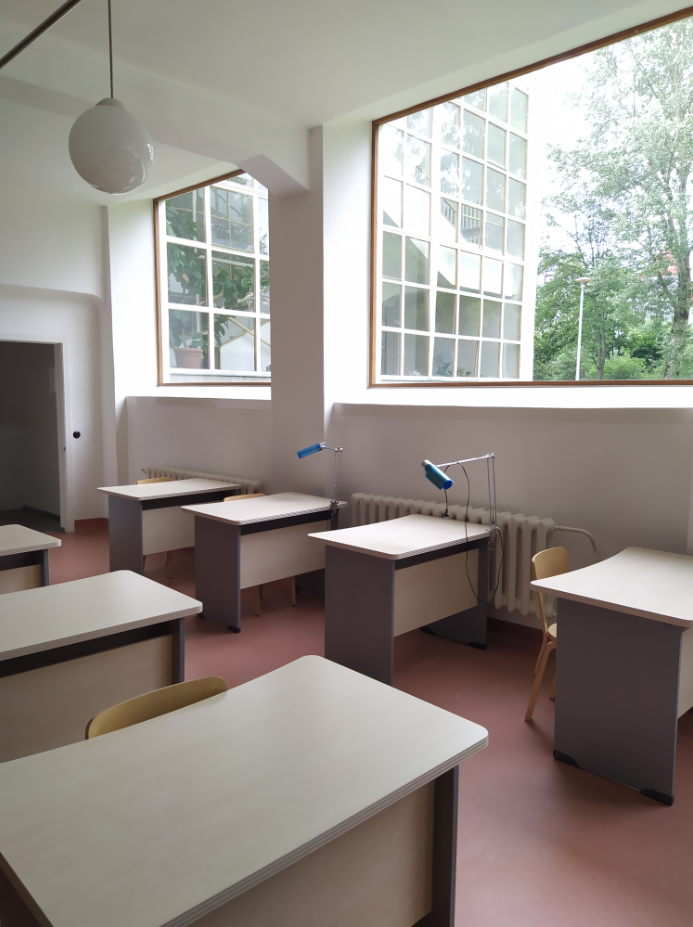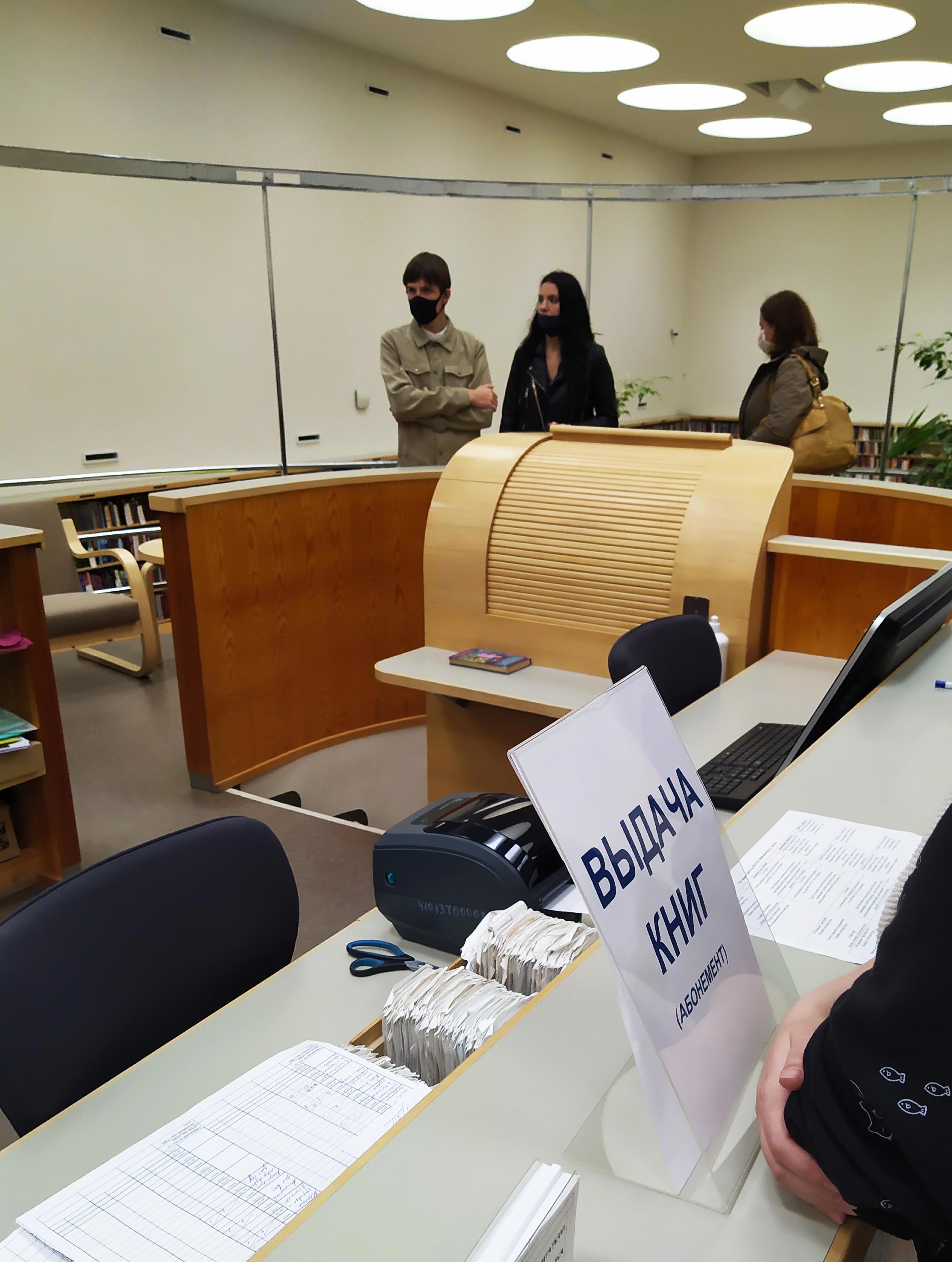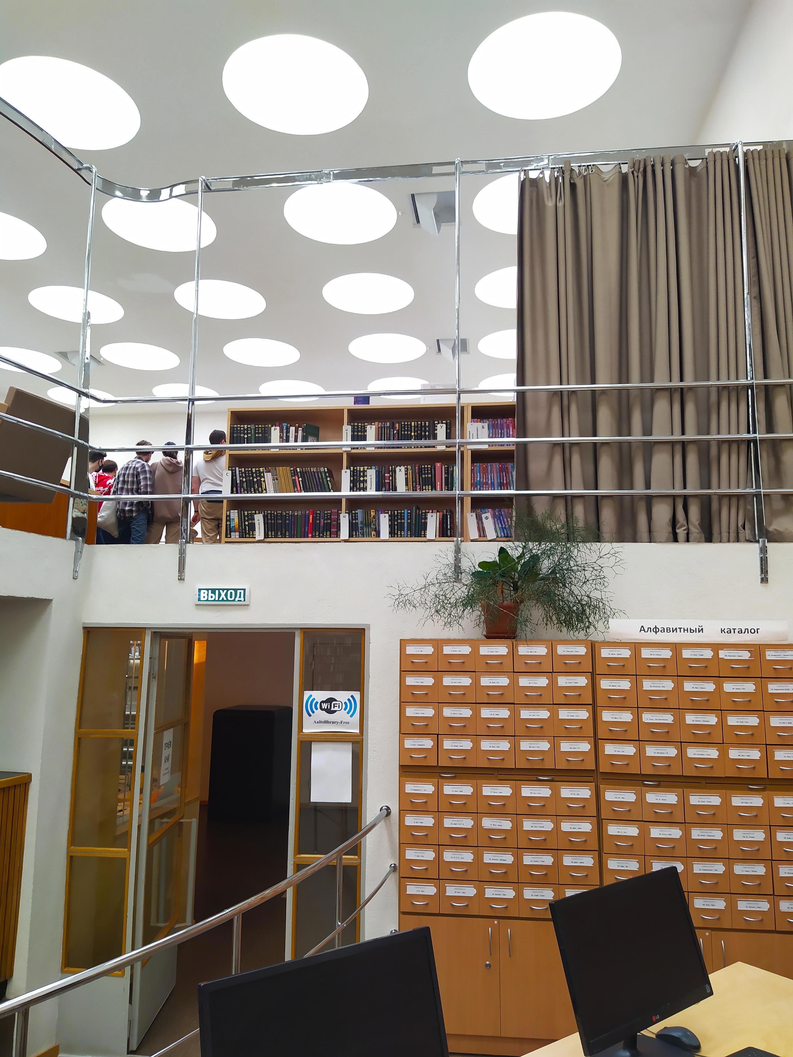 А эти столы делали делали для работы с газетами, чтобы правая полоса удобно ниспадала по скруглённой стороне. Правда, сейчас в этом зале уже не работают с периодикой, если я правильно понял.