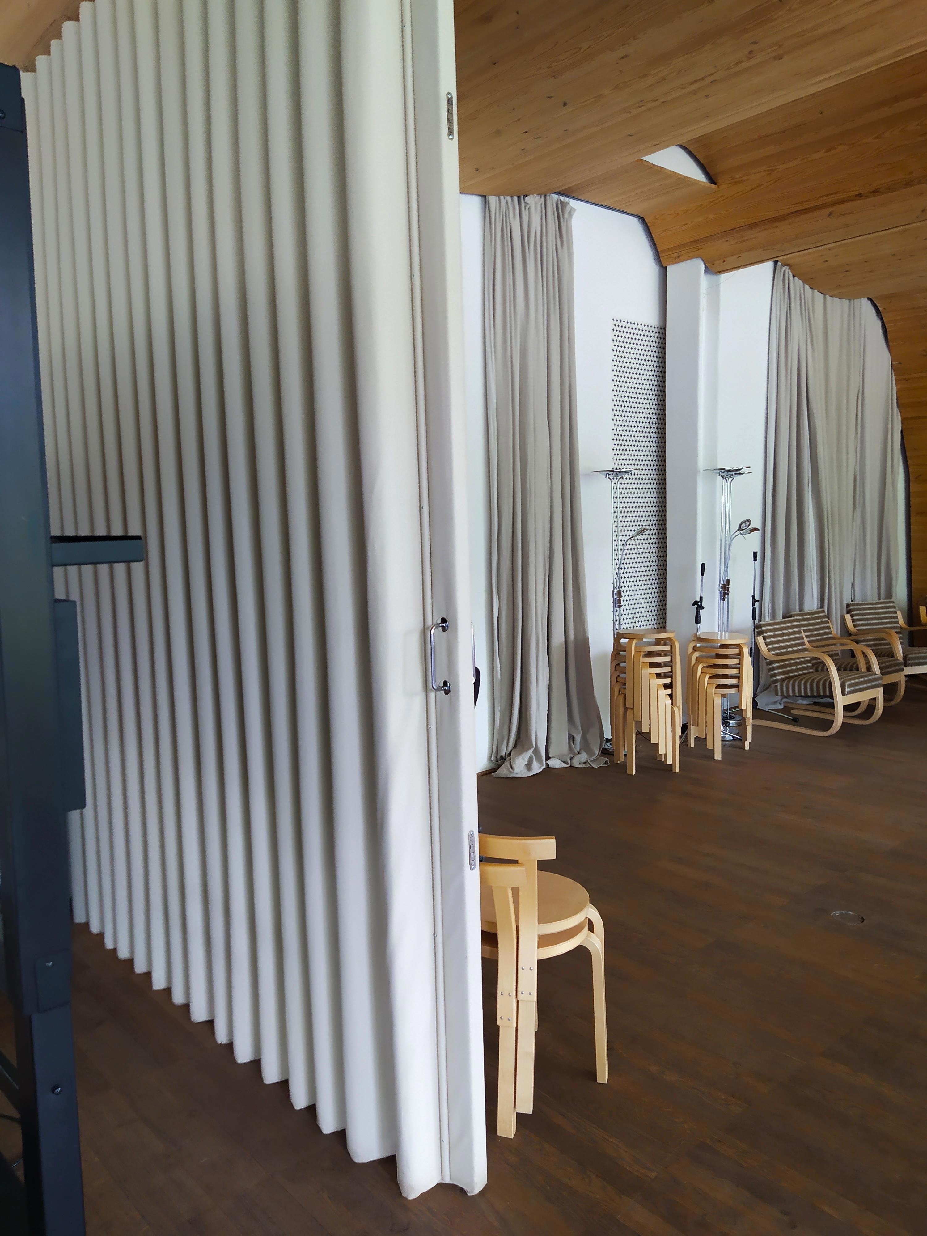 Кожаный занавес легко позволяет наглухо перекрыть зал, при надобности разделив его на два более маленьких: