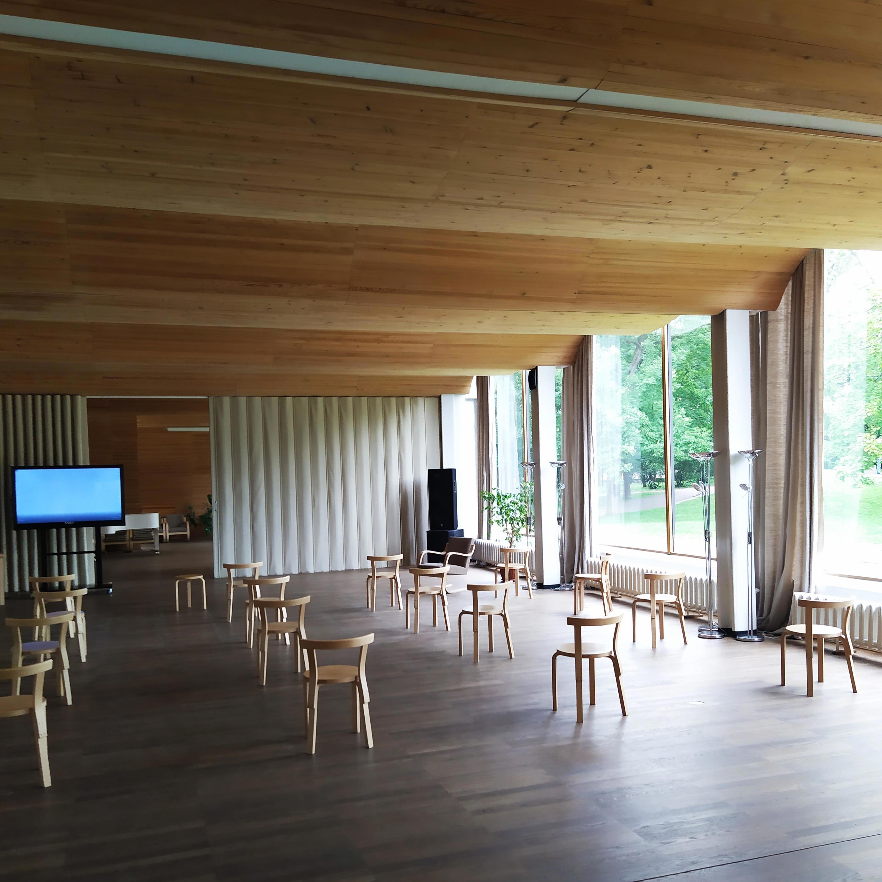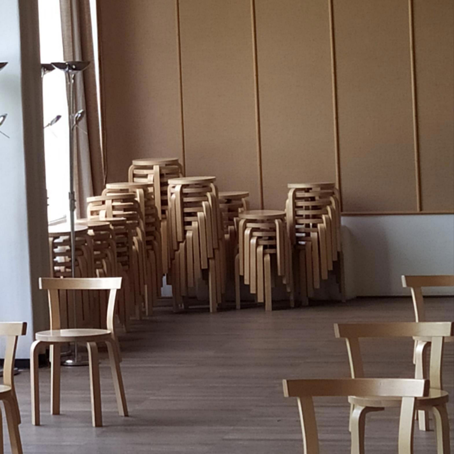 Аалто спроектировал всё: потолок, паркет, стулья, занавес, лампы. Понятно, что только электроника добавилась позже. Для потолка он подбирал дерево, дающее лучшую акустику. Я с трудом представляю, как. Лучше всего подошла сосна.