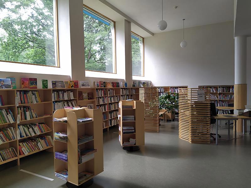 В детскую библиотеку можно попасть и сквозь главную часть, и через отдельный вход с улицы. Вид у неё более привычный. Все стеллажи низкие для удобства детей, 160см в высоту. Большие окна, через которые видна зелень.
