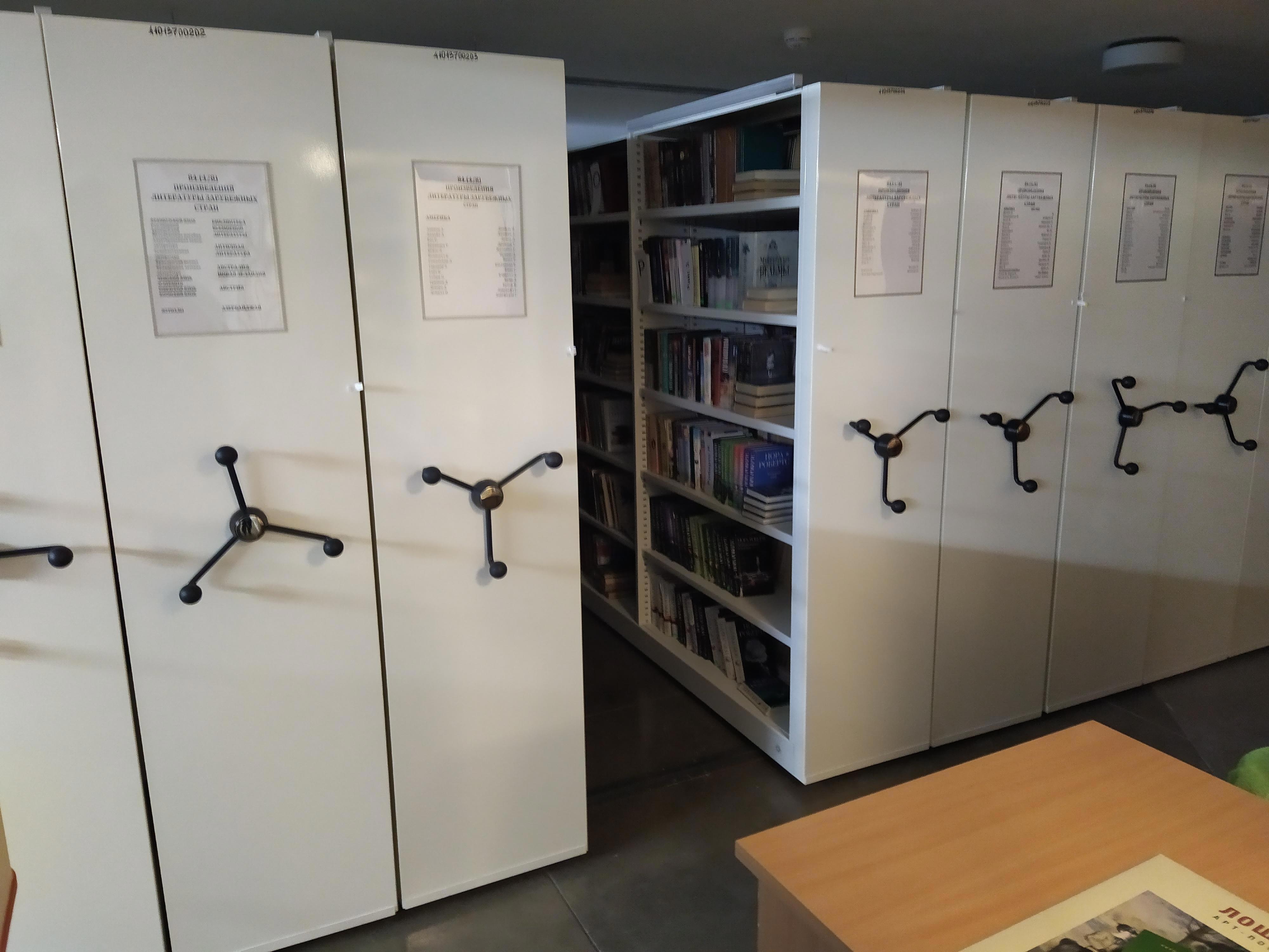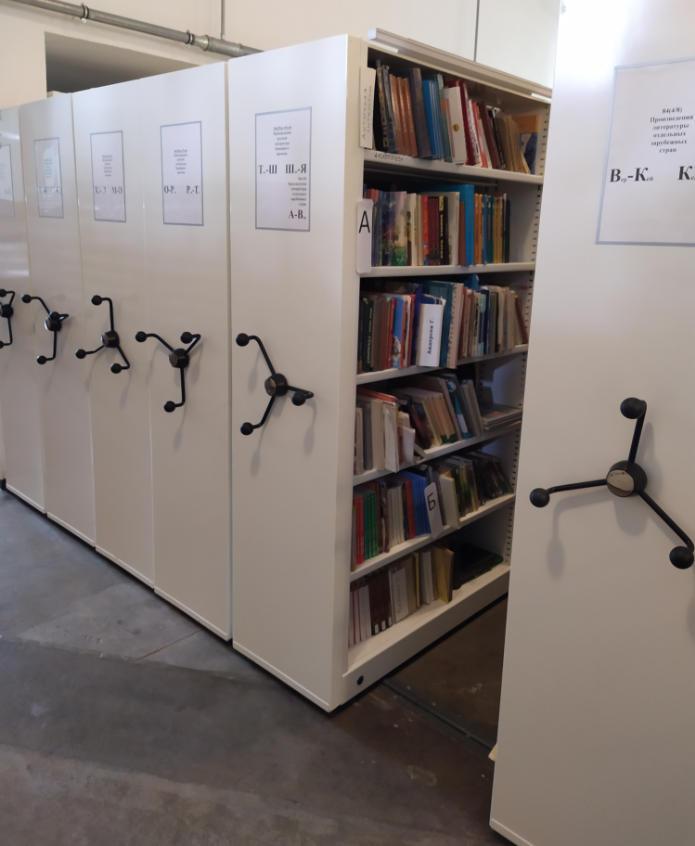 Вот так устроено книгохранилище. Чтобы сэкономить место между стеллажами, сами стеллажи стоят впритык друг к другу. Их очень легко откатывать в сторону, чтобы добраться до нужного стеллажа: