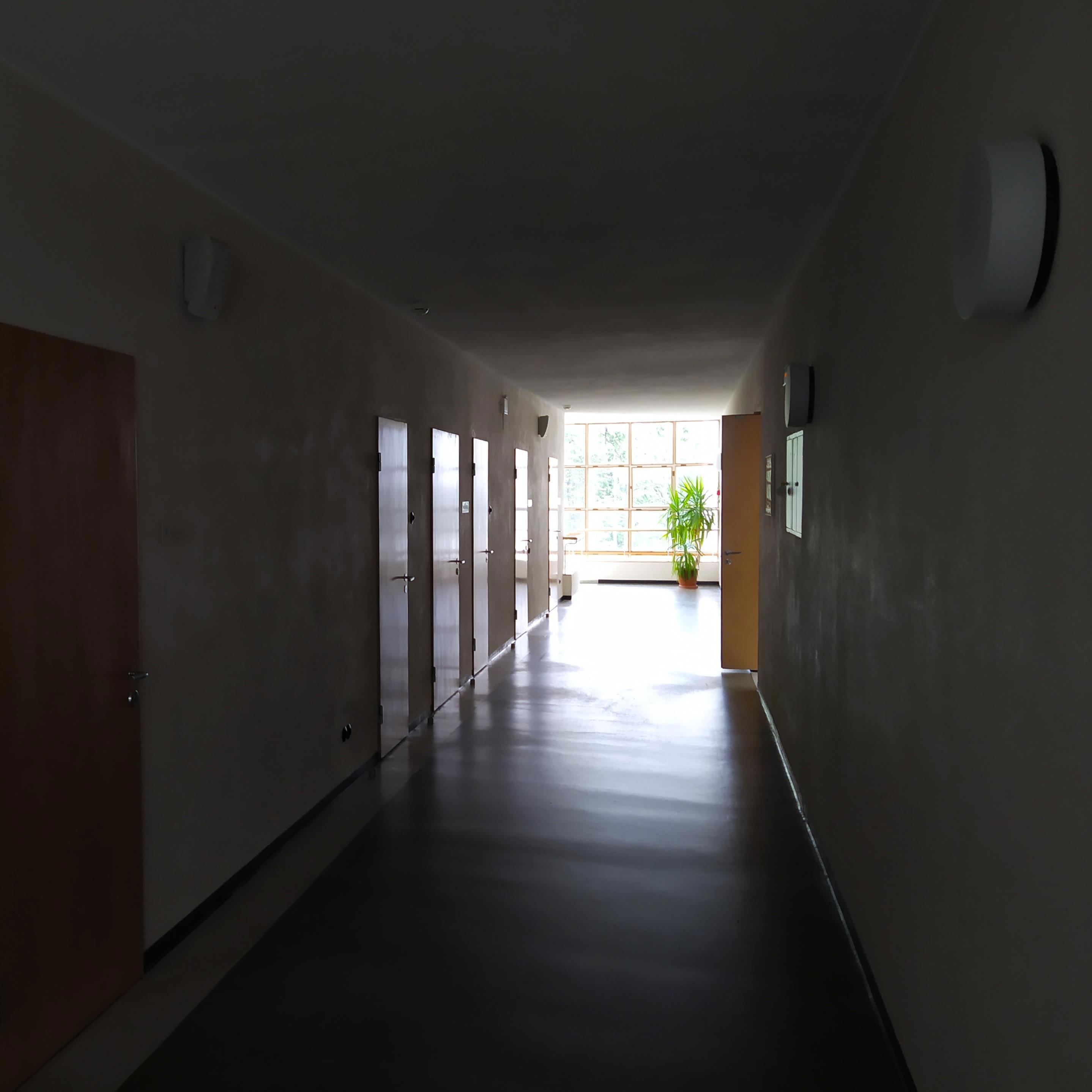 Есть, правда, в здании и строгий, абсолютно минималистичный служебный коридор с огромными окнами по оба конца.