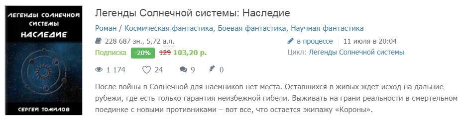 Автор: Серж ТомиловЗавершающий роман трилогии «Легенды Солнечной системы: Наследие» еще в процессе написания, но сюжет уже преодолел половину пути по необъятным просторам Солнечной системы и пояса Койпера. Невероятные приключения, радость побед и горечь потерь неотступно преследуют оставшихся в живых и кто знает (псст, автор), что их ждет в туманности будущего?