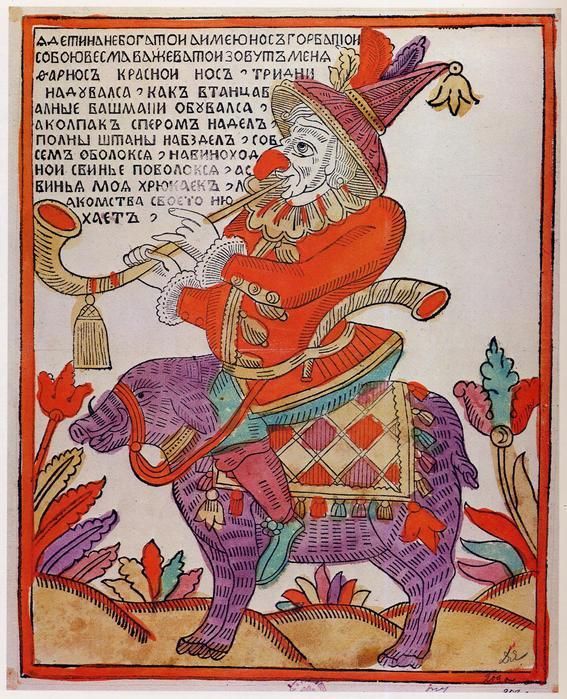 "Я детина небогатой а имею нос горбатой, собою весма важеватой, зовут меня Фарнос Красной Нос, три дни надувался, как в танцовалные башмаки обувался, а колпак с пером надел - полные штаны набздел, совсем оболокся, на виноходной свинье поволокся, а свинья моя хрюкает, лакомства своето нюхает".
