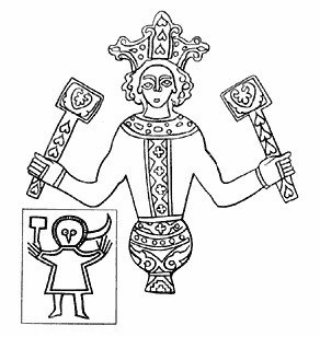 Очень интересные изделия. Я не зря начал именно с них. Обратите внимание, что археологи назначение предметов определить несколько затруднились, ограничившись достаточно безличным словосочетанием «предмет культа». Поневоле возникает вопрос, а почему, собственно именно «культа», а не инструмент какой-нибудь или оружие. Полагаю, что, увидев эти штуки они вспомнили нечто знакомое, только из более поздних времён. Вот это — изображение Александра Македонского. Того самого... а в руках у него... узнали?