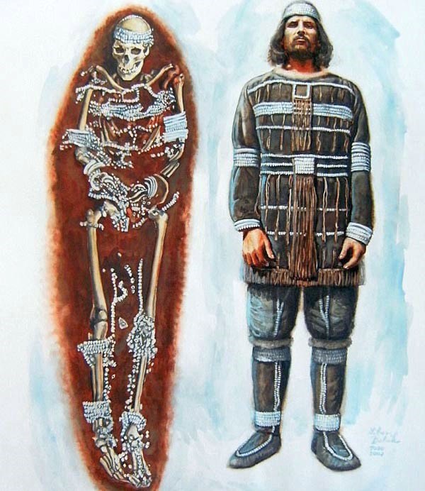 Кстати именно бусинки, покрывающие всю одежду и головные уборы благодаря своему количеству, помогли восстановить внешний вид этой одежды с очень высокой степенью достоверности и уверенно говорить о том, что эта одежда была именно сшита и очень аккуратно — никаких там «обрывок шкуры мамонта вокруг могучей талии...». Окончательно убедила в этом швейная игла из кости вполне современных размеров, включая размеры отверстия под «нитку», что заставляет всерьёз задуматься о том, что же это были за нитки — такие тонкие и прочные? В общем костюмчики были на покойных, что называется «от кутюр». Дамы, оцените «дизайн»... да и мужики тоже — удобный ведь наряд и для охоты, и для «в гости»: