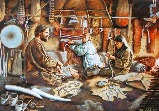 Много предметов, много материалов, много одежды… всего много. То есть образ жизни у ребят был отнюдь не походный? Абсолютно верно – описание из учебников про то, как туповатые и волосатые наши предки угрюмо топали вслед за мигрирующими стадами потенциальной еды можно смело забыть, как несмешной анекдот. Люди в Сунгире жили в домах и остатки этих домов уже раскопали. Особой монументальностью они, впрочем, не отличались, но и не шалаш из веток. С 1956 по 1977 годы командой под руководством О.Н. Бадера были обнаружены 6 строений длиной по 10-15 метров. Сделаны они были из дерева, а крышу покрывали шкурами. В центре каждого такого дома имелся очаг. Были специально выделенные места для обработки костей и камня. Такие вот мастерские на дому. О чём ещё говорит эта информация? Об очень серьёзных вещах – о принципах человеческого общежития в те времена. Помните картинки в учебниках, где «вся толпа» сидит в одной убогой пещере, где и спят, и едят, и детей родят? Получается – чушь собачья (извините за мой французский). Получается, что род поделён на отдельные семьи и у каждой семьи своя персональная жилплощадь. Прям, как сейчас – мама, папа, детишки. Ходили в гости, на работу… на охоту то бишь, вместе собирались на праздники. Только телеков не хватало, но может оно и к лучшему? Кстати, я уже упоминал, что одежда для походов в гости вполне подходящая имелась. Однако одежда ведь не только для красоты, но и против погоды… Шуб и шапок лохматых при покойных обнаружено не было. Поэтому я хочу задать ещё один риторический вопрос – а так ли морозно было в этих местах, однако?
