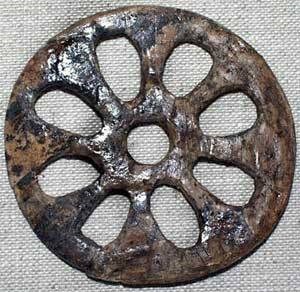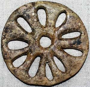 Мне, например, очень понравилась одна версия. Сказано было, что эти диски имеют солярный смысл. Действительно — очень похоже. Даже количество отверстий в дисках, что называется «по теме». Четыре дырки, например, соответствуют четырём временам года. Это символ бога Хорса (Солнце) в славянской мифологии. Остальные прорезные диски тоже имеют чётное количество отверстий. Собственно, интересно как раз то, что ничего «нового» или загадочного в этом нет. Такие элементы — круги с 4, 6, 8, 10 и 12-ю лепестками встречаются везде, где побывали славяне и чуть не на всём, к чему прикасались их умелые руки — прялки, наличники на окнах, посуда, украшения и т. д. и т. п. И в раскопках каменного века в различных «культурах» на территории нашей страны такие элементы также встречаются повсеместно. То есть опять явно видна преемственность культуры с древнейших времён. И нужно чётко понимать, что такие изделия не просто некая «непреходящая мода», а нечто основополагающее, имеющее сакральный смысл — традиция. В этих изделиях не только искусство, но и символизм, и астрономия, и религия, прошедшие через тысячелетия.