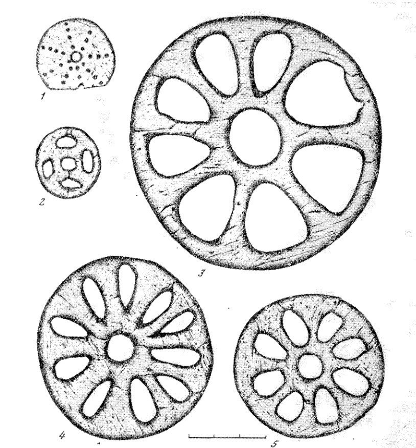 Далее идут диски из бивня мамонта. Первый - диск с точечным орнаментом и отверстием в центре. Предмет культа. Диаметр — 31 мм, толщина 3-3,5 мм. Следующий — прорезной диск. Предмет культа. Он был припаян известью в вертикальном положении к большому копью. Бивень мамонта, резьба, шлифовка, сверление. Диаметр — 70 мм, толщина 5 мм. Ещё один прорезной диск. Он был закреплён на одном из костяных дротиков. Материал и техника те же. Диаметр — 55 мм, толщина 3 мм. Ну и ещё пара дисков. Вот они: