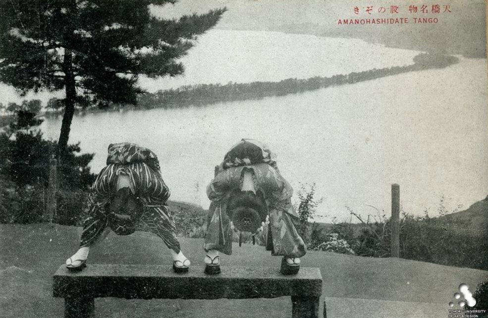 А еще таким способом смотрят на некоторые пейзажи в надежде увидеть "мост на Небеса". Самое известное в этом плане место - Аманохашидатэ, расположенное на самом севере префектуры Киото и входящее в тройку лучших видов Японии. Для того, чтоб полюбоваться "небесным мостом", около Аманохашидатэ устроена смотровая площадка со специальной платформой. Она существует, как минимум, полторы сотни лет.