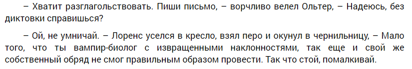 Итак, главным неоспоримым достоинством этой книги являются её герои: увлекающийся научными экспериментами вампир Ольтер и рыцарь Ордена Священного Пламени — Лоренс. Один — высокомерный засранец с большим и благородным сердцем, что он всячески пытается скрыть, а второй — прямой, как его рыцарский меч, безбашенный чудила, начисто лишённый даже зачатков страха и инстинктов самосохранения. Наблюдать за их разговорами, договорами, развитием характеров и отношений было для меня истинным наслаждением!