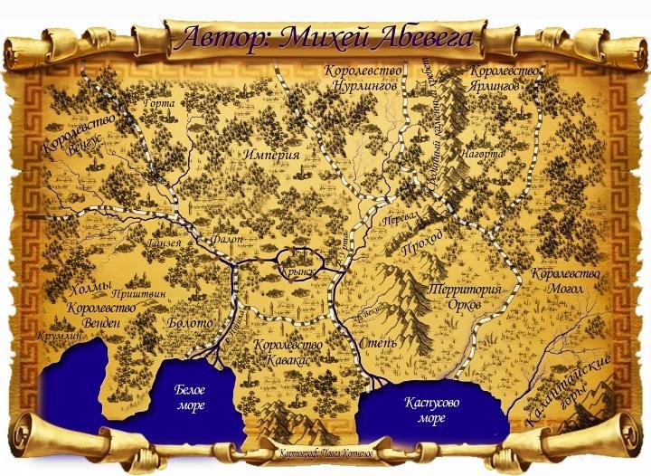 "Близился вечер. Сколько лиг они пробежали, только Создателям ведомо. Холмистое предгорье, давно сменившее степь, было более скудно на траву и богато на выпирающие из земли камни. Хорошо, что первый день весов давно позади. Дело к лету и до темноты еще далеко. Но и сейчас уже солнце, почти свалившееся к горизонту, ярко освещало только лишь дорогу по холмам вверх, пряча спуски в неприятную серую хмарь. Горы впереди дыбились несокрушимыми исполинами, уткнувшимися в самое небо. Воздух стал прохладней и как будто прозрачней."