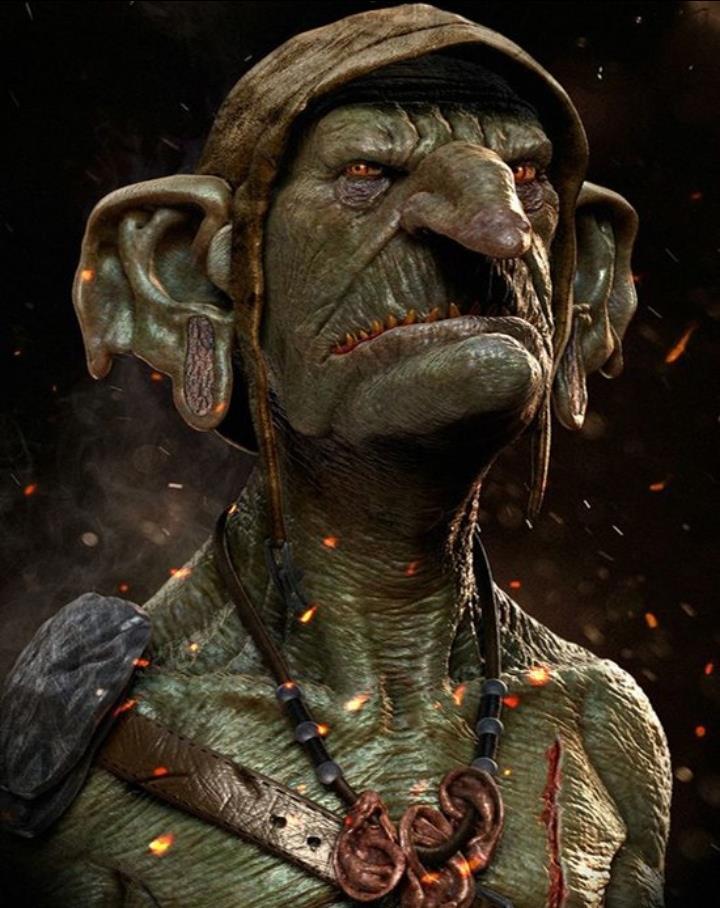 Это коблы - чуть ниже людей, с длинными ушами, носами и острыми зубами. Вот они как раз имеют зеленоватый цвет кожи и очень вредный характер. Хотя играют в придуманном автором мире более положительную роль, чем коблитты.