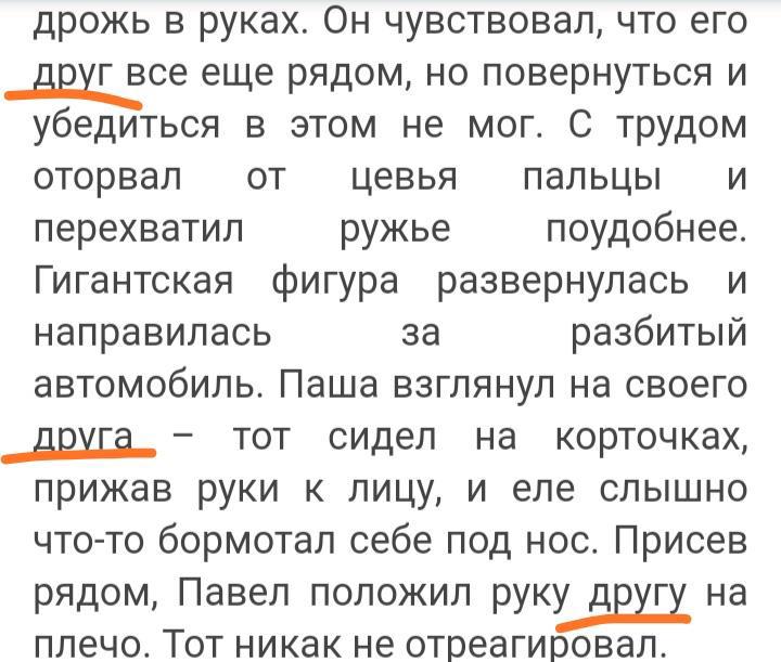 Встречаются в тексте порой и логические нестыковки. Или, скорее, провалы. Так всё в той же седьмой главе тот самый герой, общающийся с трижды другом, пытается застрелить из ружья чудище, собирая последние силы, а потом и теряя их. Из последующих глав мы конечно узнаём, что мужик в обморок от переизбытка чувств упал. Но по ходу повествования я лично этого не заметил и для меня явилось загадкой, куда и почему делись силы у вполне здорового, хоть и не вполне трезвого мужика. То ли болезнь его какая внезапно поразила, то ли встретился он с энергетическим вампиром, то ли подстрелили его, а мы этого и не заметили. То есть причина потери сил оказалась в тексте малость недораскрытой.