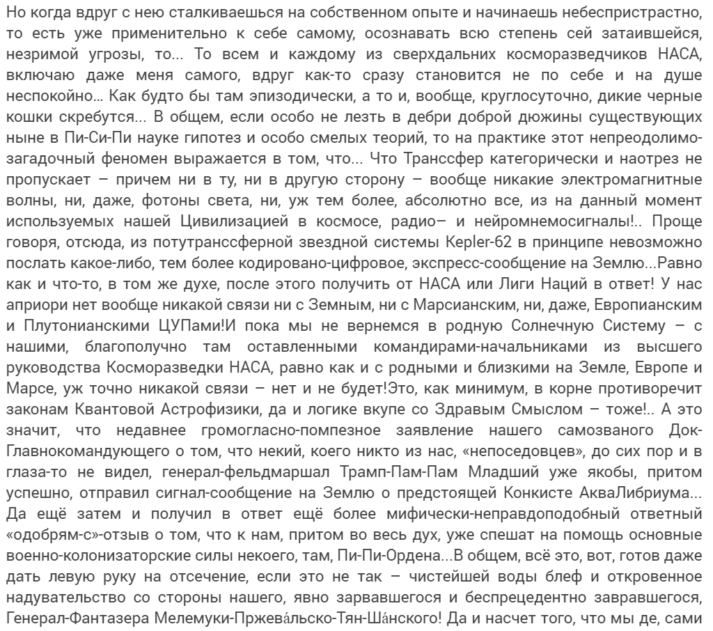 Экрана не хватило, чтобы одну только реплику заскриншотить. Представьте себе диалог, состоящий из подобных реплик, каждая размером с небольшую главу, – каково его читать?