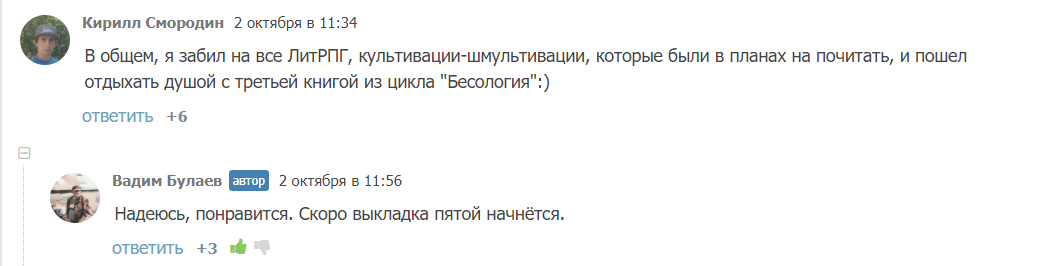 Довольно забавно получилось: я взялся за третью книгу о приключениях Иванова и Швеца, решив отдохнуть от топовых романов про нагибаторов-культиваторов и мегагеймеров, о чем и сообщил автору в комментариях (коммент прилагается в конце абзаца), а третья «Бесология» началась как раз с того, что Серега учится владеть Силой, чтобы развиваться как маг.