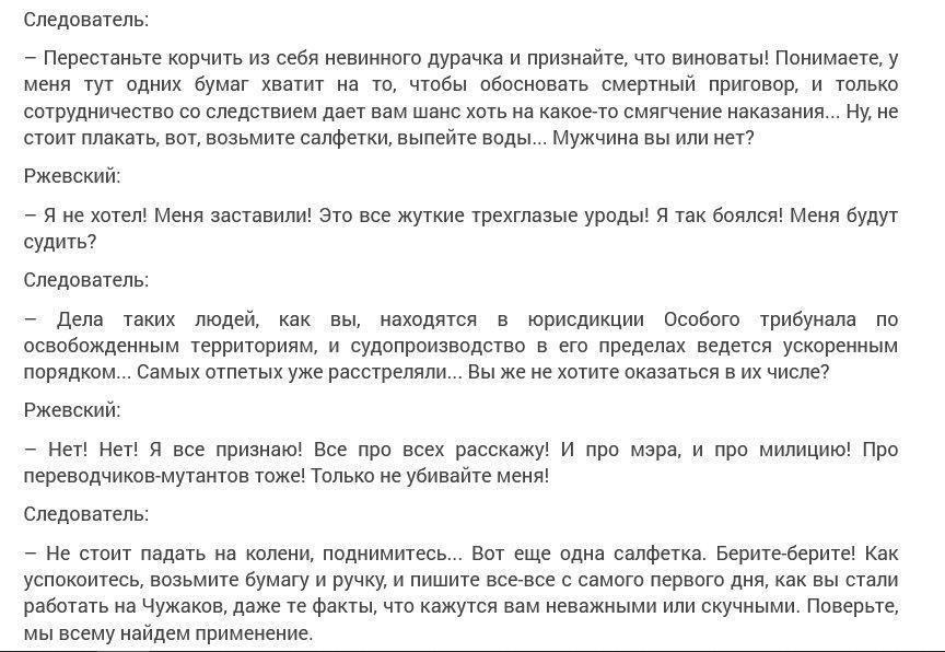 У героев осталось только две можные реакции: тудыть — кисло соглашаться с событиями, или сюдыть — обзываться и ругаться. Они все словно под деструктивным гипнозом или после операции по ампутации вариабельности реакций. Любое препятствие на пути включает у них негодование. Из массы возможных реакций, они всегда выберут обидки и обвинялки. А потом догонят и плюнут в морду. Если есть шанс человеку поверить, и в общем-то при определённом желании вполне легко можно было ПРОВЕРИТЬ, кто написал трактат о языке пришельцев, то следователь предпочитает отмахнуться. Потому что системе нужно покарать так называемых «предателей», многие из которых точно такие же жертвы упавшей им на головы чужой системы.