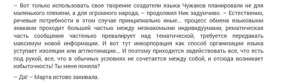 Краткая суть: речь и система языка, будучи продуктом мысли, будучи показателем умственно-культурного развития, способна и наоборот влиять на развитие мозга и личности. И вот отсель произрастает еще одна моя придирка. Мало мне было про пришельцев. То есть, у меня возникли некие подозрения, откуда и почему они образовались. И да, для формы политического памфлета на уровне «1984» — всего было узко-достаточно. Но для полноценного художественного произведения МНЕ БЫЛО МАЛО.