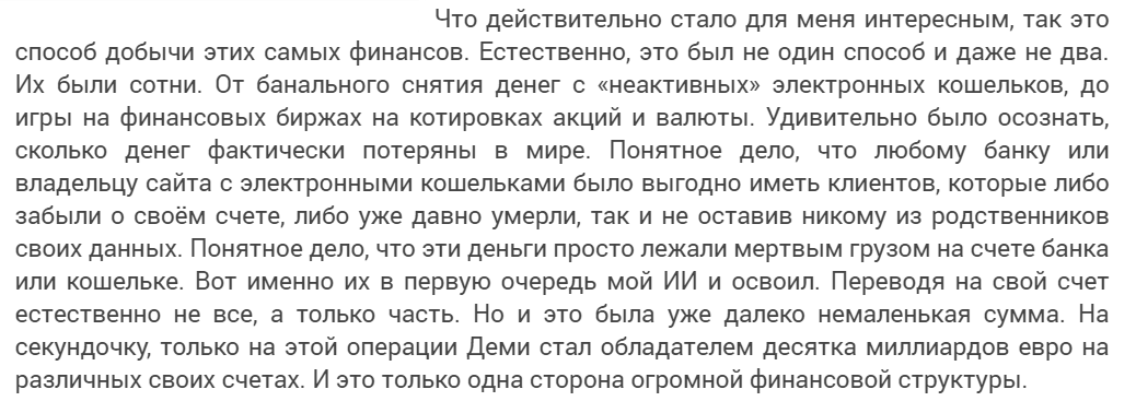Костюмы нынче недешевы, поэтому деньги в стыренном кошельке быстро иссякают. Однако, Игорь по-прежнему не унывает и дает задание ИИ что-нибудь придумать. Тот, натурально, придумывает, и буквально через пару абзацев Игорь – счастливый обладатель нескольких миллиардов евро на секретных банковских счетах. Вы не ослышались, нескольких миллиардов евро.
