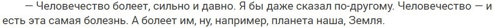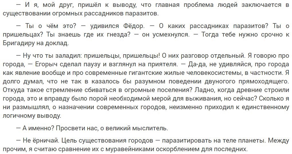 Речь эту толкает персонаж как бы положительный, который вообще молодец, позиционируется знатоком жизни, носителем философских взглядов, Прометей от истины. К этому моменту симпатия к старичкам уже в читателе взращена. Поэтому выходит, что тут я, читатель, должна к его словам прислушаться. А к чему прислушиваться, простите? К тому, что старый дед сидит и под водочку разглагольствует, что он-де с двуногими прямоходящими ничего общего не имеет, города-рассадники с их паразитами презирает, хотя сам двуногий прямоходящий и в мегаполисе жил до последнего?