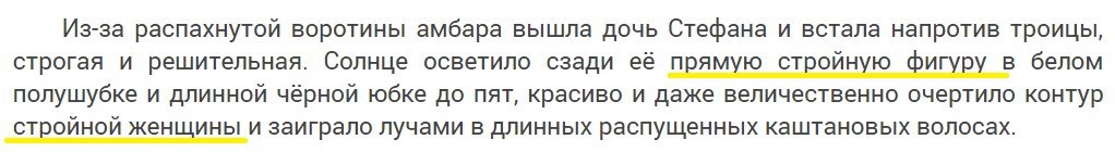 А вот в отношении описаний придется сказать, что не блеск. Женщины, например, или награждаются словом «стройная» или и того не удостаиваются. А стройная – это как? Понятно, что автор имеет какой-то свой взгляд и вкус. Но «стройная» — это оценка, а не описание. При таких оценках читателю приходится видеть не картинку напрямую, а изображение через призму мнения автора. Оценил «стройная» — и все тут. Но как это? Если не «песочные часы» с третьим размером груди, то уже и не стройная? И все вот такие шаблонные там ходят? Модели. В пост-апокалипсисе.