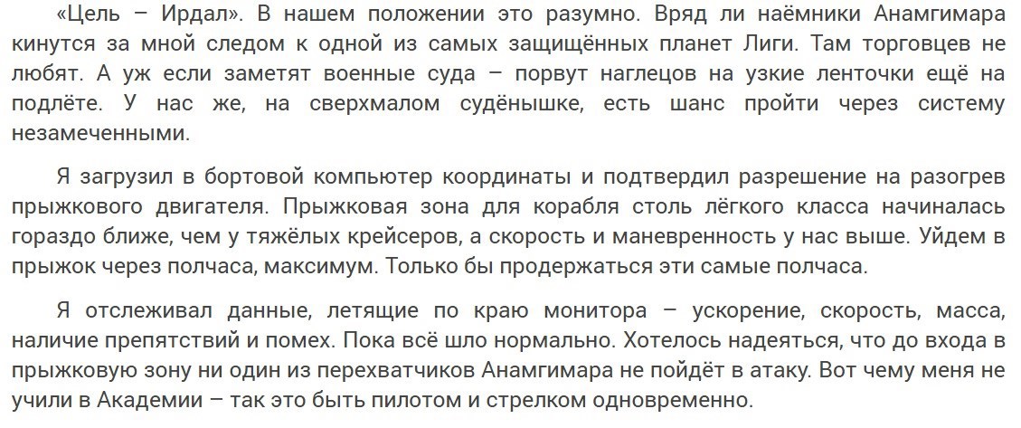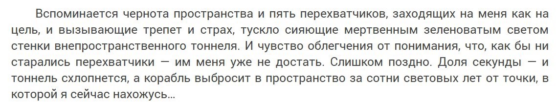 Собственно сама дальнейшая сюжетная движуха — удирание от перехватчиков в космосе, спасительный нырок в подпространство — в кадре отсутствует. Зачем показывать погоню, если можно показать в подробностях, что герой чувствует после того, как после погони потерял сознание и после того, как пришел в себя. Когда кто-то за кем-то гонится на космических кораблях — это совершенно не нужные вещи в фантастическом романе, верно?