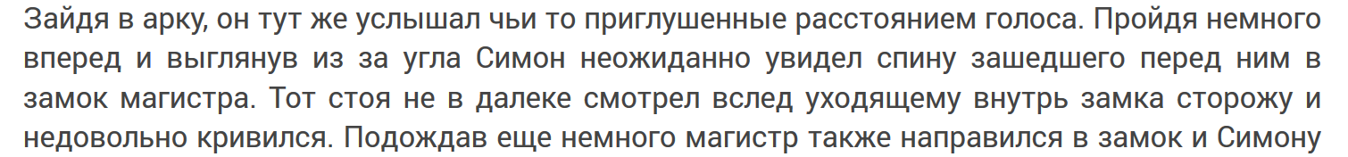 Интересно как главный герой мог со спины видеть лицо магистра? И «чьи то» и «из за» правильно писать через дефис, то есть «чьи-то» и «из-за».