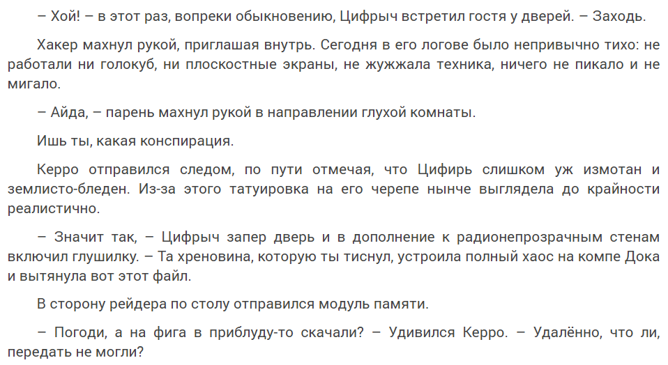 Если коротко, то достаточно интересно, чтобы читать дальше, ибо есть неплохой такой сюжет и несколько персонажей, за которыми просто интересно наблюдать. Я не из «фиялок», которые бросают читать, едва завидев кровькишки или маты, на меня другие отсечки надо ставить. Да и градус кровькишков, на самом деле, в целом умеренный, встречался мне и более откровенный в этом план трешак, ещё и не такое видали. Аморально? Ну так вы всегда знаете, на что подписываетесь, открывая книги жанра «киберпанк». Когда это в киберпанке было морально?