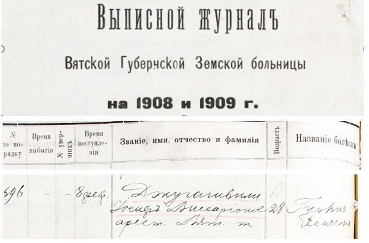 А это цитата из книги – "Одна только строчка в выписном журнале Вятское губернской земской больницы на 1908 год за номером 696 осталась, что лечился в оной с восьмого по двадцатое февраля Джугашвили Иосиф Виссарионович двадцати восьми лет от роду с диагнозом возвратный тиф".
