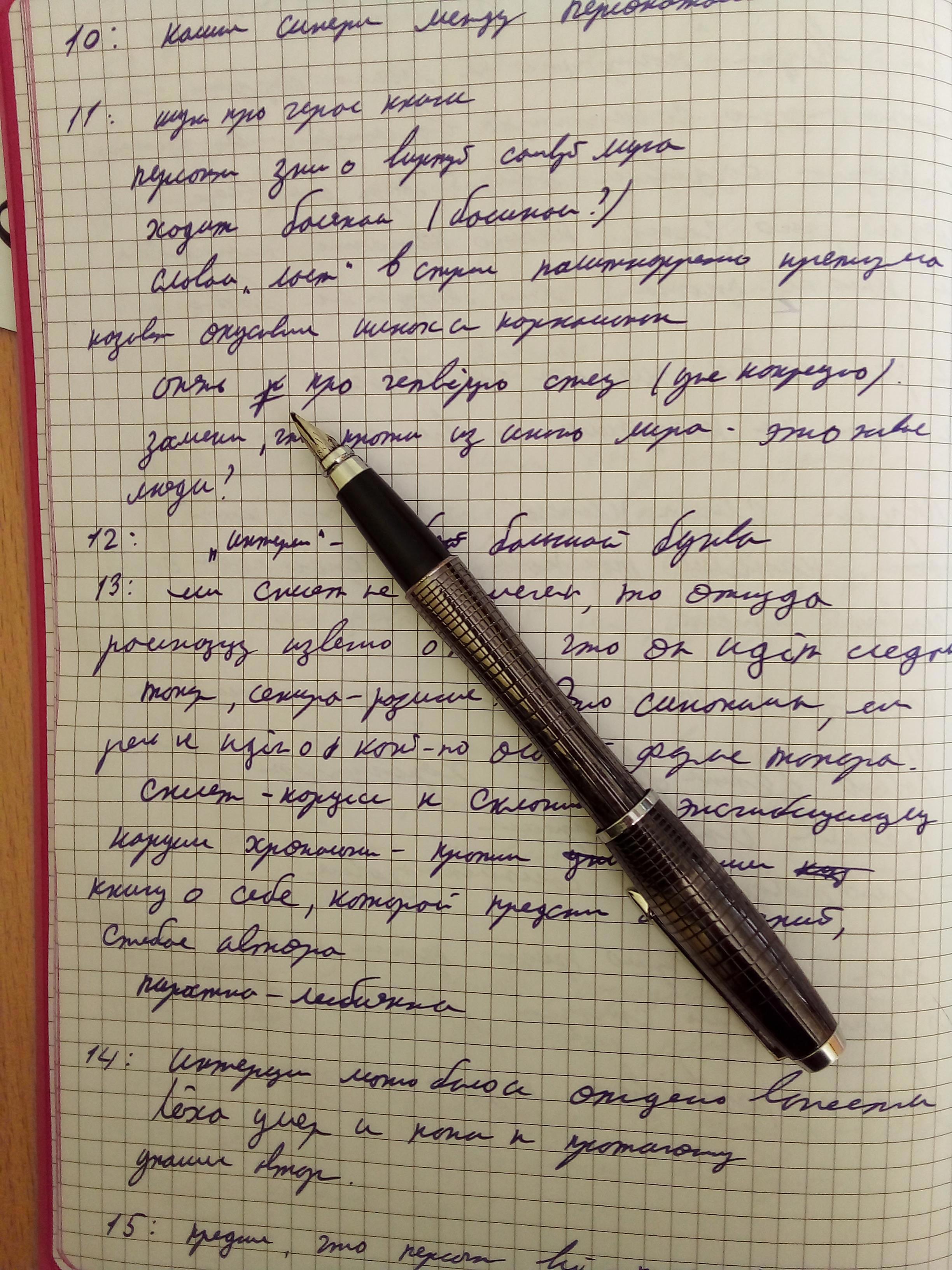 Писал пером, само собой. Шариковыми ручками писать я уже давно разучился. Будь это написано обычной ручкой, вы бы вообще ничего не разобрали.