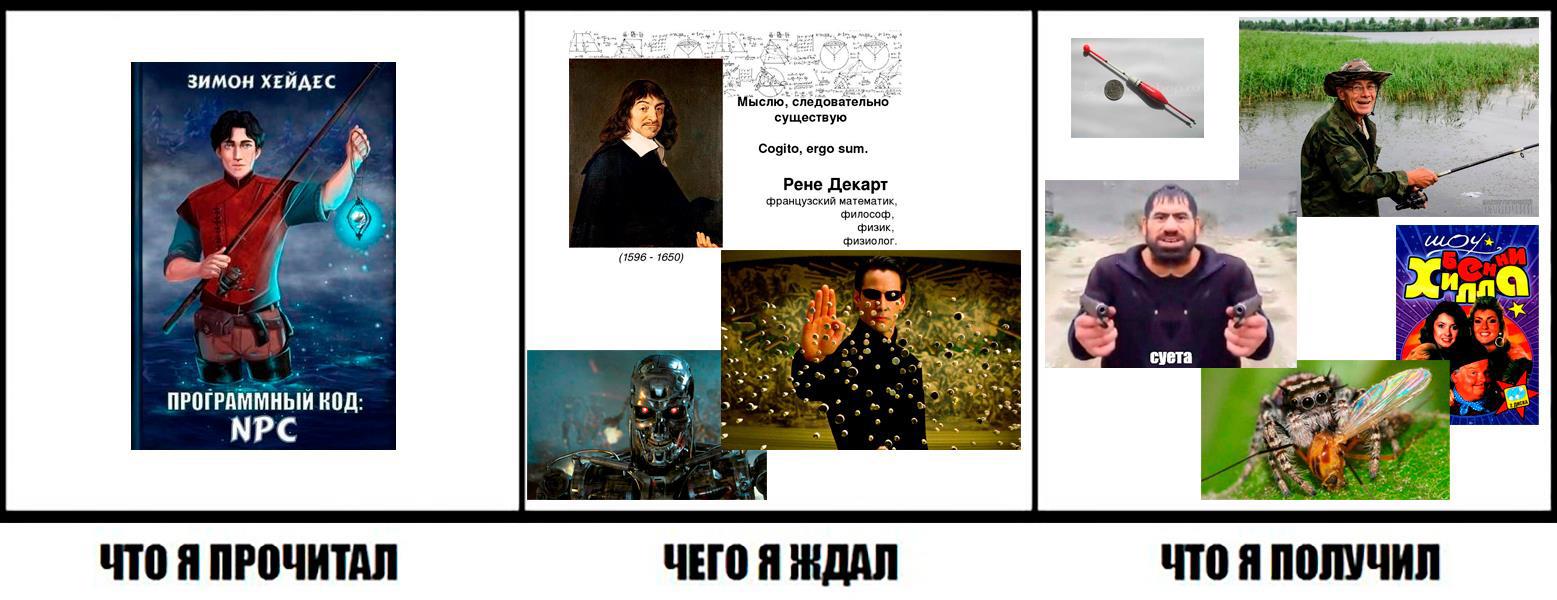 В центре сюжета — рыбак Саймон, персонаж в рамках игры эпизодический, квестовый НПС из низкоуровневой локации. В какой-то момент он осознаёт себя, уходит с одним из игроков и тем самым ломает игру. И если в начале книги за ним интересно наблюдать, то ближе к концу, когда понимаешь, что ничего особенного уже не произойдёт — интерес пропадает. Как главный герой — он никакой, особого раскрытия и развития я не заметил, хотя уж на рефлексии искина можно было навертеть столько идей, что на дюжину литрпг-циклов хватит. Да, кое-какая рефлексия есть, и порой любопытная, но в целом — нет, не сработало. Причины и процесс самоосознания тоже непонятны, хотя я просто мог пропустить их за тоннами боёвки и различных мелочей.