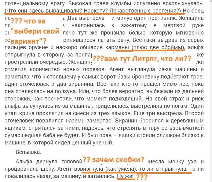 Во-первых, странная любовь автора к скобкам, в которые как-то необычно прячутся видимо мысли героини. На мой взгляд, если мысли героини оставляем в тексте, то оформлять нужно иначе! (или выключать это «женское радио» в голове спецагента. Если Альфа настолько крута, что думает одновременно о разных вещах в любой, даже самый экшн- момент, и если это действительно нужно по сюжету, то оформляем иначе!).