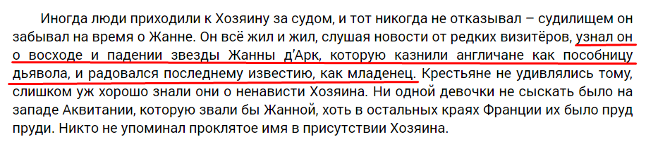 И вот место, время и имя героини растолкали сонных тараканов в моей голове, и они такие: ага, Франция, столетная война и Жанна... д'Арк! Конечно, это была не она, но тараканы никак не хотели успокаиваться, не смотря на увещевания автора о распространенности имени от крестьянки до королевы (и в тексте, и так) и о времени событий романа. Поэтому я, как один из героев романа, в определенный момент повествования сильно повеселился, и тараканы успокоились.